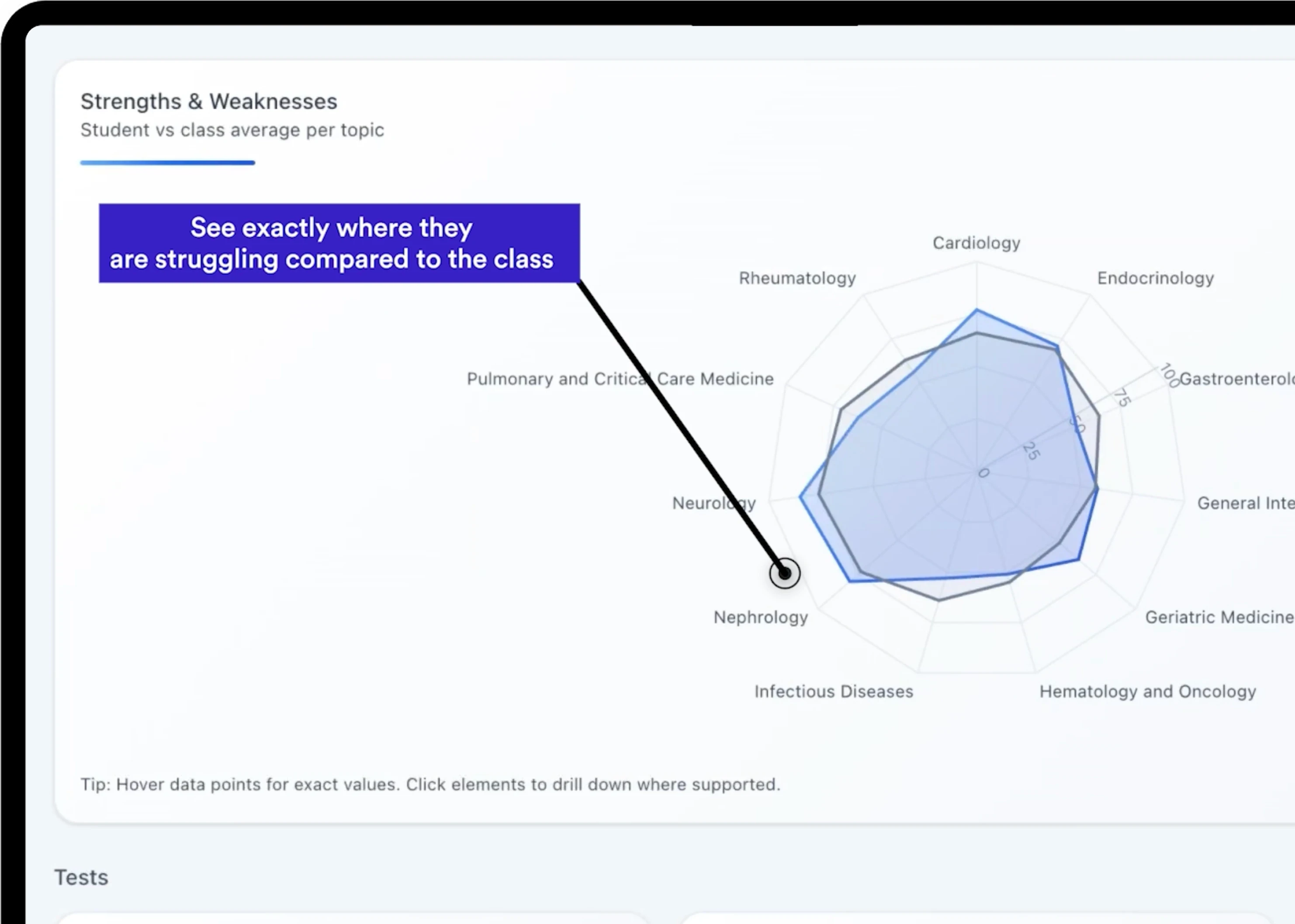 Automated data and insights help instructors personalize remediation, guide study plans, and strengthen clinical reasoning.